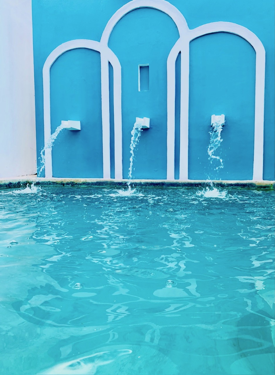 -Swimming pool with waterfall fountain.
