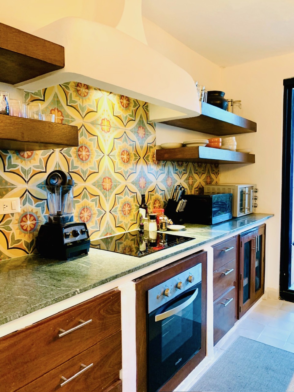 -Kitchen: refrigerator, coffee station, wine cellar, stove, all appliances, silverware, general props.
