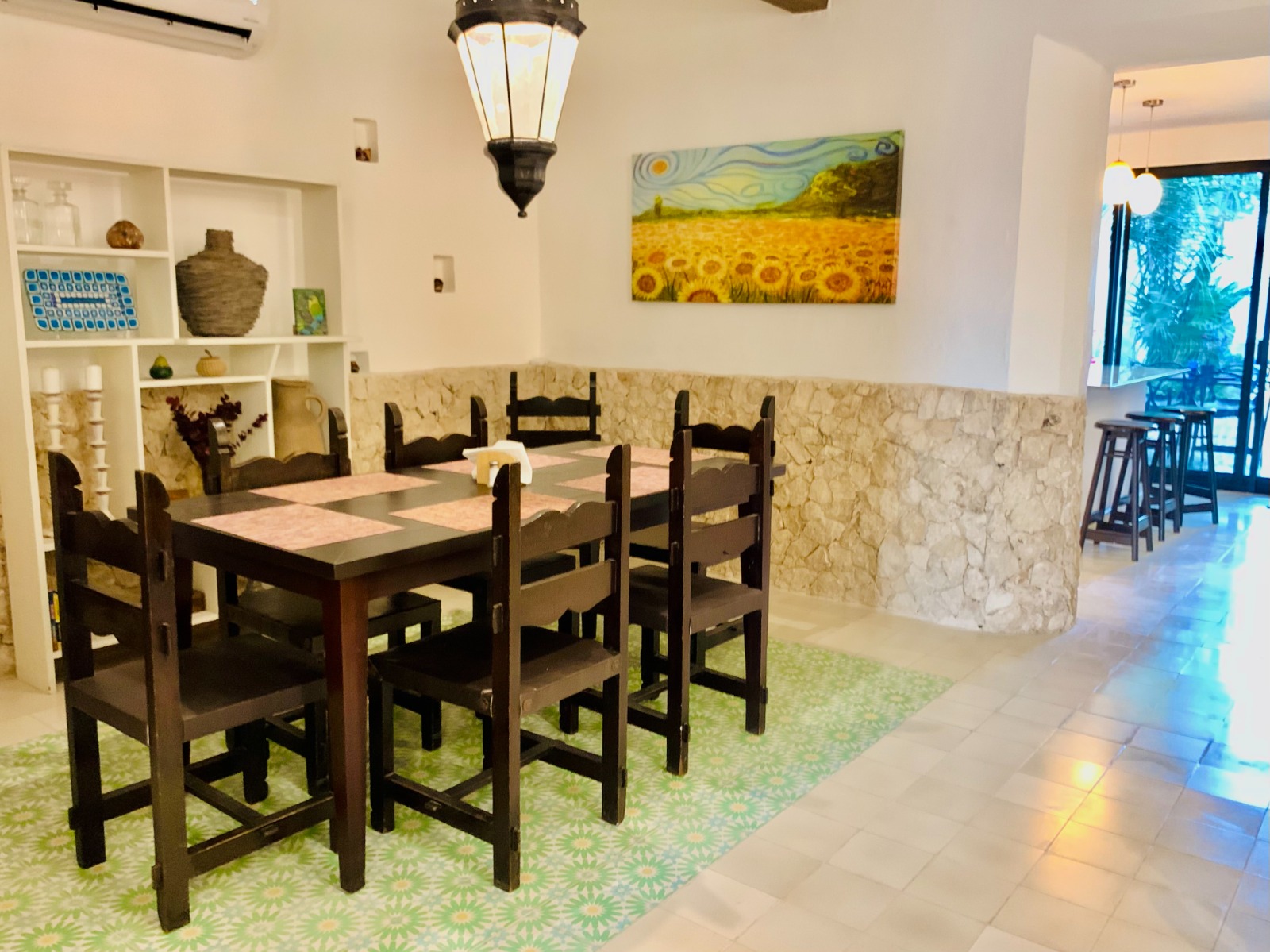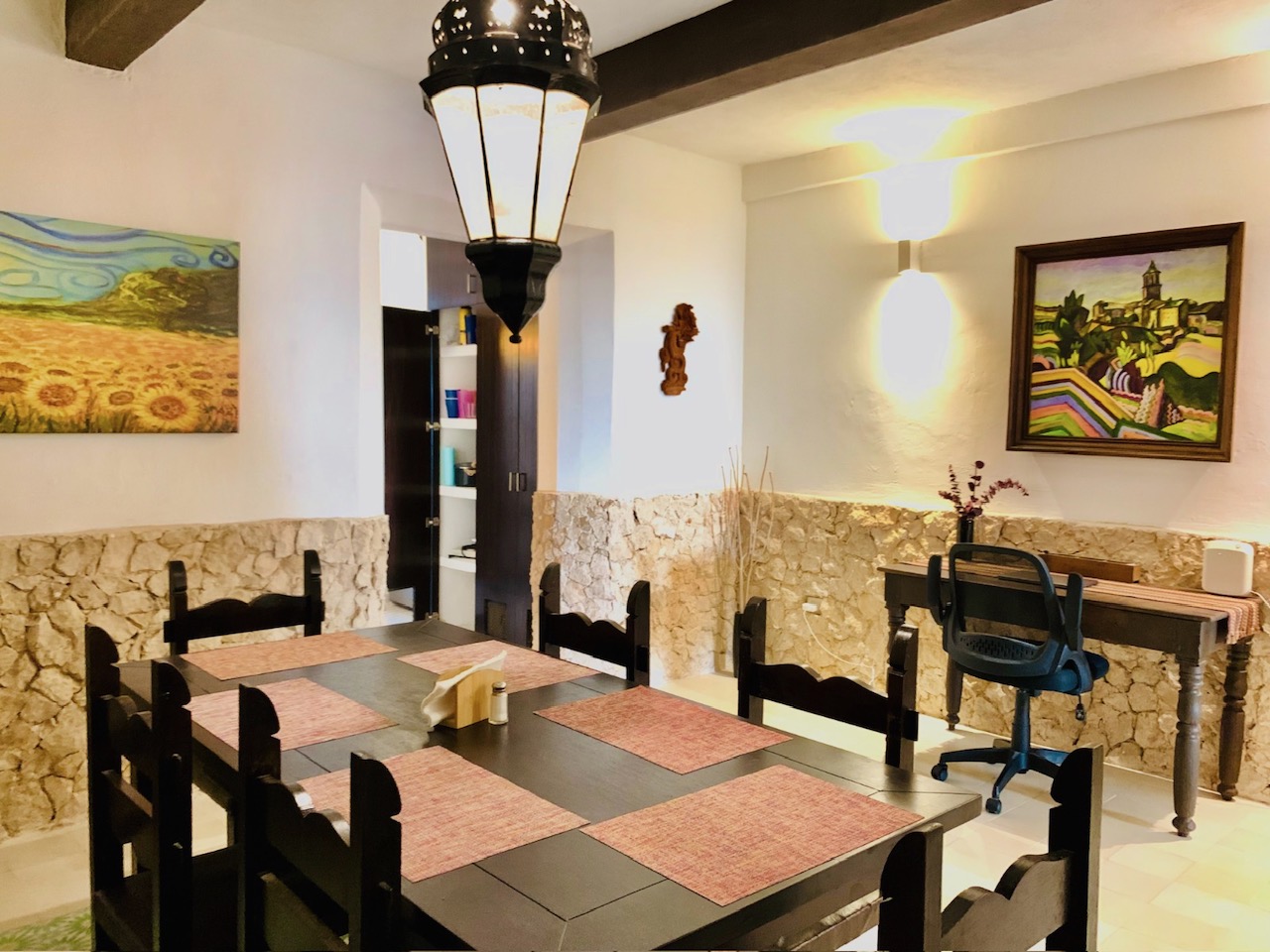 -Dining room: dining room for 6 people, Turkish/Andalusian style lamp, desk.