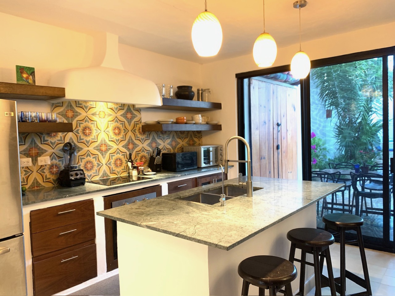 -Covered back terrace with dining area for 4 people perfect for having breakfast outdoors.