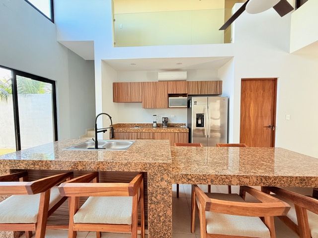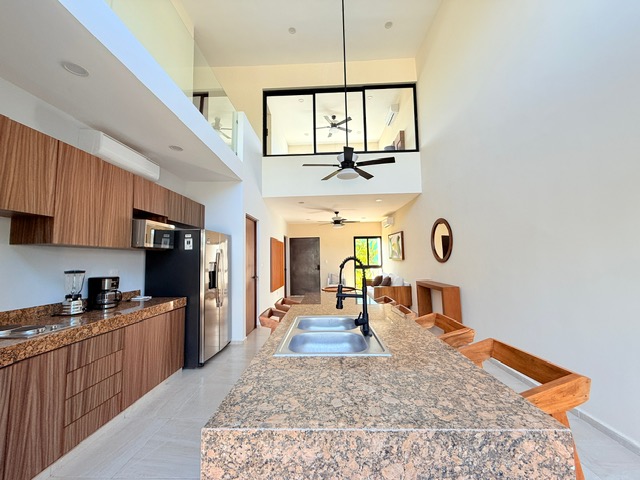 *** Equipped Kitchen with Island and Granite Countertop. Includes cabinetry, electric induction cooktop, refrigerator, microwave, blender, and coffee maker.